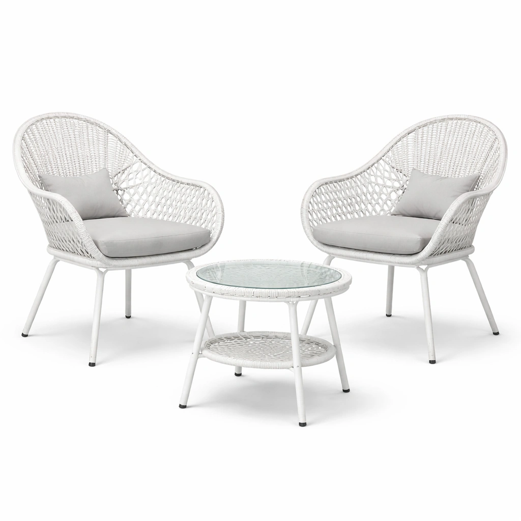 El conjunto incluye dos sillas y una mesa. Las sillas cuentan con estructura de acero recubierta de resina de ratán, mientras que los cojines son de poliéster con relleno de espuma. El vidrio de la mesa es templado de 5 mm de grosor.