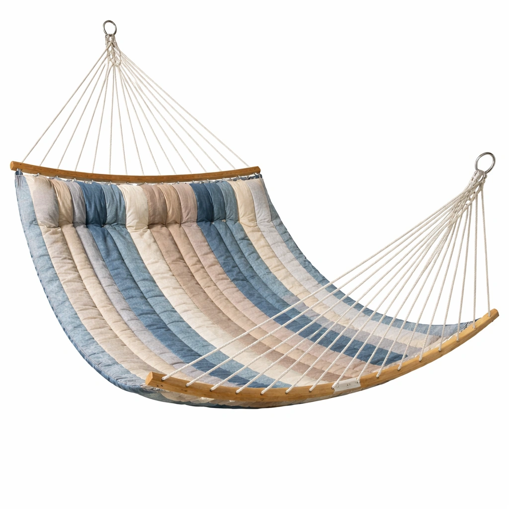 Hamaca de algodón con diseño de rayas en tonos beige y azul, con estructura de barra de madera. Dimensiones de 200 cm de largo y 100 cm de ancho, con una capacidad de carga de 150 kg. No es impermeable, uso recomendado en interiores o climas secos. Apta para adultos. Se recomienda lavar a mano y almacenar en seco cuando no esté en uso.